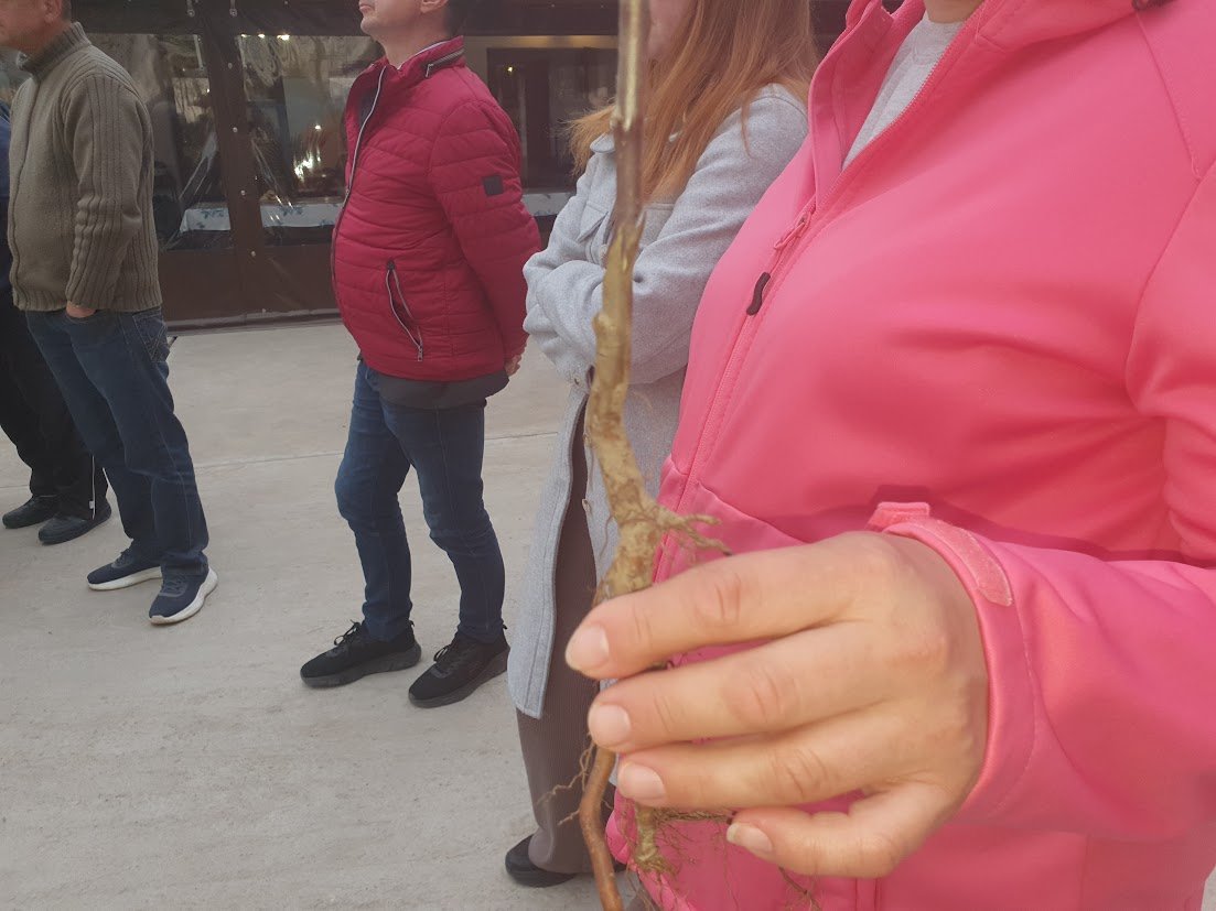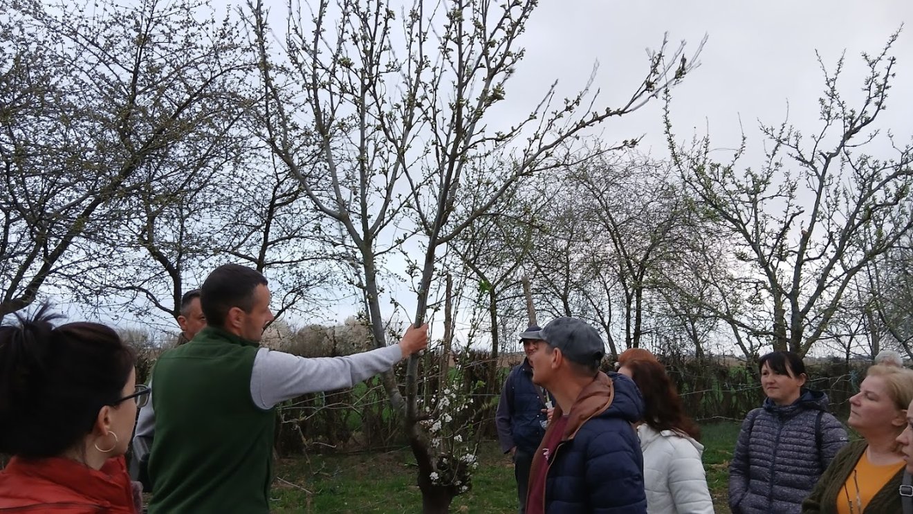 A tanulás nem állt meg az udvaron: a résztvevők a gyümölcsösbe is átvonultak, ahol egy meglévő fán mutatták be az oltást. Ennél a módszernél az alany kérgét felnyitják, majd az oltóvesszőt a kéreg alá csúsztatják. Ezt főként idősebb, vastagabb fák esetében alkalmazzák.