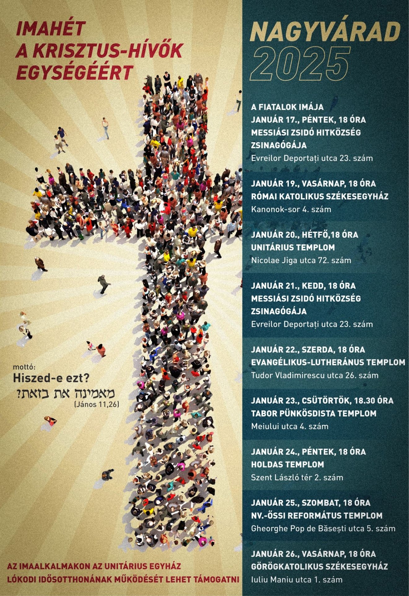 „A közöttünk, keresztények között fennálló megosztottság botrány! Krisztus azért jött el, hogy szeretetközösséget hozzon létre közöttünk, nem pedig azért, hogy megosszon bennünket.” (Ferenc pápa). 2025. január 17–26. között Hiszed-e ezt? (Jn. 11,26) mottóval tartanak imahetet Nagyváradon a Krisztus-hívők egységéért. Az idei imaalkalmakon az unitárius egyház lókodi idősotthonának a működésére adakozhatnak a hívek.
