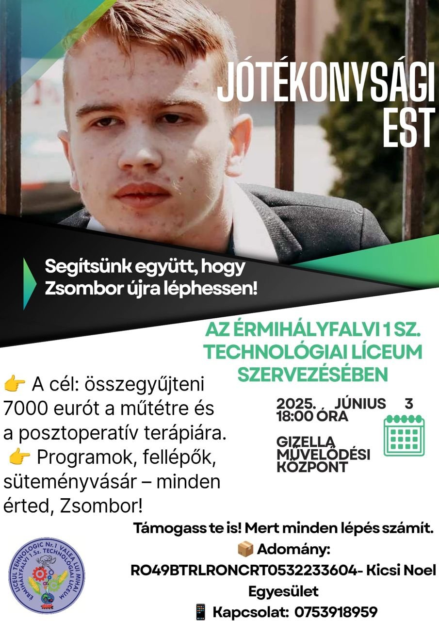 „Támogassuk együtt Zsombort és családját ebben a nehéz helyzetben, hogy számára is elérhető legyen az, ami számunkra természetes. Szeretettel várunk mindenkit június 3-án a jótékonysági esten, bizonyítsuk be azt, hogy a közösség ereje minden nehézséget képes leküzdeni!” – áll a tanintézmény szerkesztőségünkbe eljuttatott felhívásában.