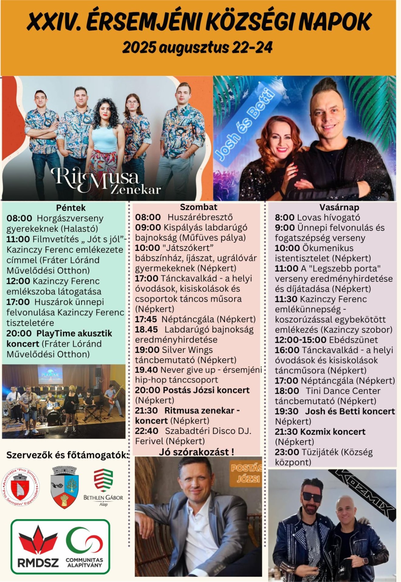 A szombati és vasárnapi rendezvények általában a Népkertben zajlanak, ott lesznek a koncertek is, melynek húzónevei szombaton Postás Józsi (20 óra) és a RitMusa Zenekar (21.30 óra), vasárnap Josh és Betti (19.30 óra), illetve a Kozmix (21.30 óra). Ugyanakkor az elmúlt évek hagyományaihoz hűen vasárnap délelőtt 10 órakor ökumenikus istentiszteletet tartanak a Népkertben, majd 11.30 órakor megkoszorúzzák Kazinczy Lajos mellszobrát a művelődési otthon parkjában.