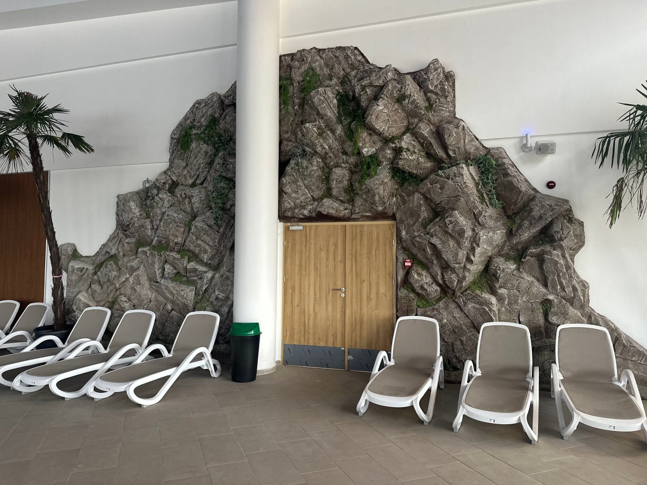 Az impozáns és modern létesítmény hasznos összterülete 2.823,45 négyzetméter, és két szintet foglal magába. Befogadóképessége 350 személy. Az alsó szinten vannak a vizes medencék, gyerekeknek és felnőtteknek, valamint a jakuzzi. Ugyanitt kaptak helyet a zuhanyzók, a sókamra, a szaunák, a pihenőszoba, a masszázsszoba, a fitnesz- és a játékterem (ahol lehet majd asztaliteniszezni és biliárdozni is), a kisgyermekek játszószobája, a kávézó és az elsősegélyszoba.