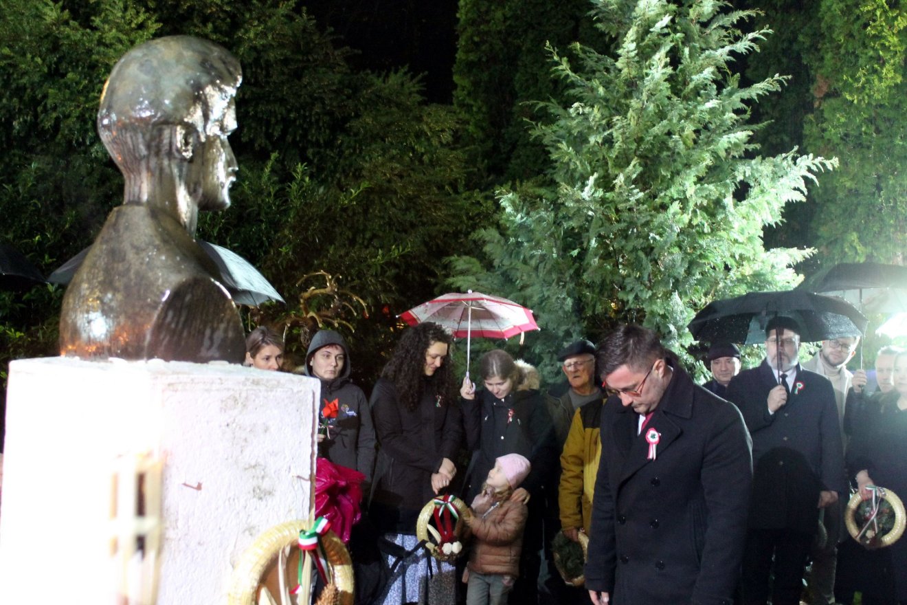 A művelődési háztól fáklyás felvonulással haladtak a református templomkertben lévő Petőfi-szoborig, ahol koszorúzás zajlott. Ezen a helyszínen Kotlár Dominik IX. osztályos diák szavalata hangzott el. Kovács Gyula református lelkipásztor áldásával és a Himnusz közös éneklésével zárult ezen a helyszínen a megemlékezés.