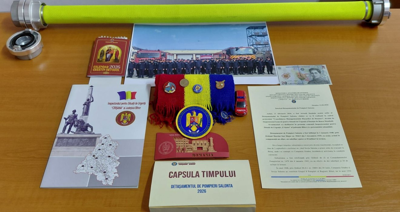 Az időkapszulába a szalontai tűzoltóállomás és a Bihar megyei katasztrófavédelem számára jelképes jelentőségű dokumentumok és tárgyak kerültek, többek között az alosztály története, az aktuális szervezeti felépítés, a teljes személyi állomány névsora, jelvények, katonai kitüntetések, a megyei felügyelőség kiadványa, valamint egy csoportkép a jelenlegi állományról.
