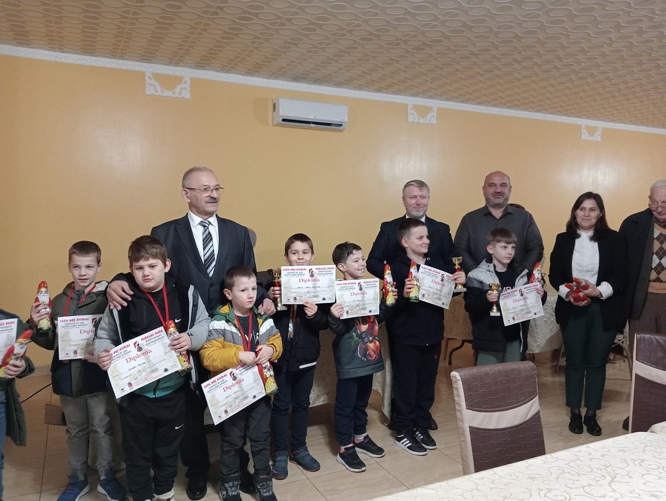 A verseny ideje alatt a fiatal sakkozókat gazdagon megterített büféasztal várta, így a fordulók közötti szünetekben volt lehetőségük felfrissülni és beszélgetni egymással. A díjazásnál a szervezők nemcsak a győztesekre gondoltak, hiszen mindenki egy-egy Mikulás-csokival térhetett haza. Az érmeket és a díjakat Mados Attila-Ferencz, Bihardiószeg polgármestere, Szabó Ödön, az RMDSZ Bihar megyei szervezetének ügyvezető elnöke, valamint Szabó Melinda helyi tanácsos adta át a fiataloknak.
