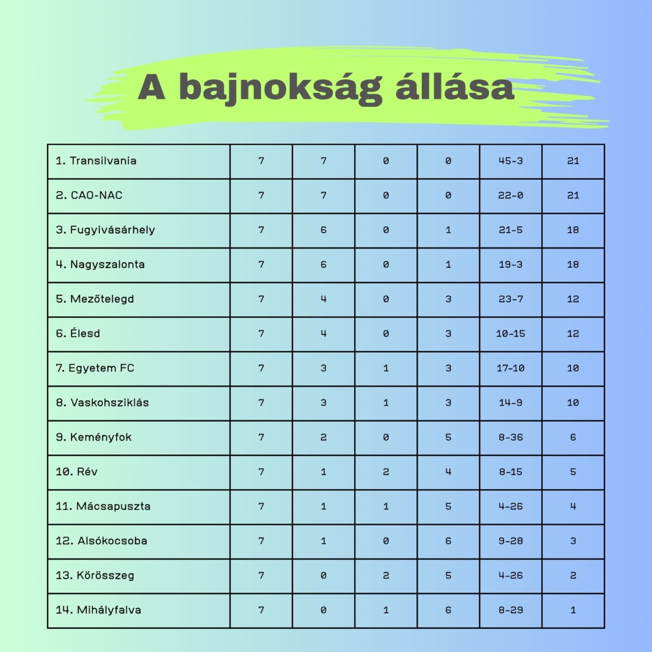 Továbbra sem talált legyőzőre a Transilvania Academy és a CAO-NAC a negyedosztály idei kiírásában. A Transilvania ezúttal nehéz mérkőzést vívott a Nagyváradi Egyetem SK otthonában, ahol csak a hajrában szerzett góllal tudta bebiztosítani a 2–1-es győzelmet. A CAO-NAC ezzel szemben magabiztosan, 5–0-ra nyert Keményfokon. A zöld-fehérek egyedüli csapatként állnak kapott gól nélkül a bajnokságban.