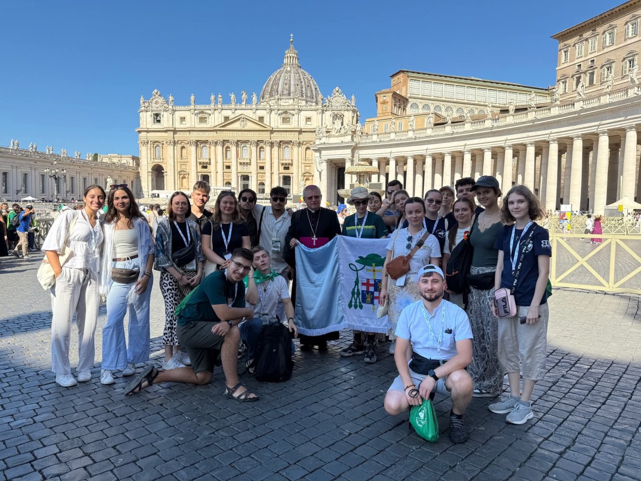 A Jubileumi Ifjúsági Találkozóra érkezett több mint kétezer magyar fiatal is letáborozott a Róma külterületén lévő Tor Vergata mezején. A váci egyházmegye zászlaját vivő Kovács Zsolt ifjúsági lelkész vezette be a magyar csapatot a szabadtéri oltár előtti hatalmas mezőre.